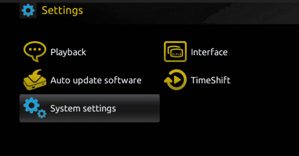Step 1: When the box is being loaded the main portal screen appears. After that click on “settings”, and press the remote button “SETUP/SET”.